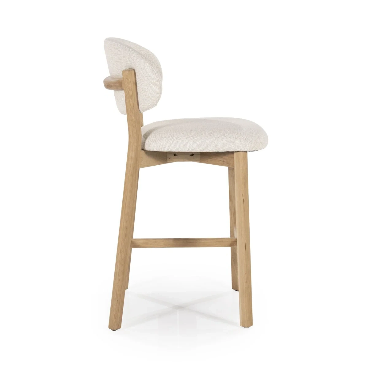 De Mikky barkruk heeft een eiken houten frame met een stof bekleden zitting rugleuning. De zithoogte is 68cm en geschikt voor een maximale bladhoogte van 98cm bovenkant barblad. Je kunt de barkruk op maat laten maken door ons. Geef de hoogte van de bovenkant van je barblad aan ons door en wij zorgen voor de juiste zithoogte (1 week extra levertijd)